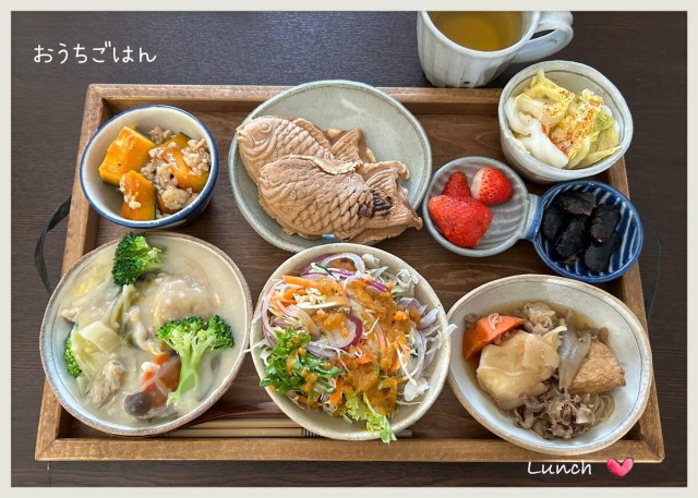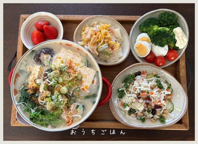 未分類 •メタバリアプレミアムEX 11:00 【mizkan ごま豆乳鍋つゆ】(七味) 白菜 にら 豆腐 ほうれん草 鶏団子 椎茸 ネギ 餅✖️1個 •サラダ(フレンチ) キャベツ きゅうり 玉ねぎ にんじん酢漬け パセリ 豆 •白菜漬物(七味) •ブロッコリー たまご(マヨ) •苺64g 用意し過ぎ残したよ