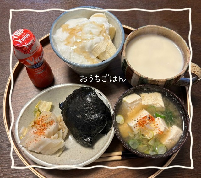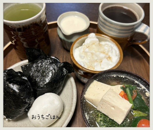 未分類 •生酵素 •メタバリアプレミアムEX 【6:30】 •鮭おにぎり?✖️2個 たまご ごはん100g✖️2 •味噌汁(一味) 豆腐 ブロッコリー トマト ほうれん草 •バナナ86g ビヒダス脂肪0ヨーグルト100g(きびオリゴ糖5g) •コーヒー •豆乳100ml •お茶